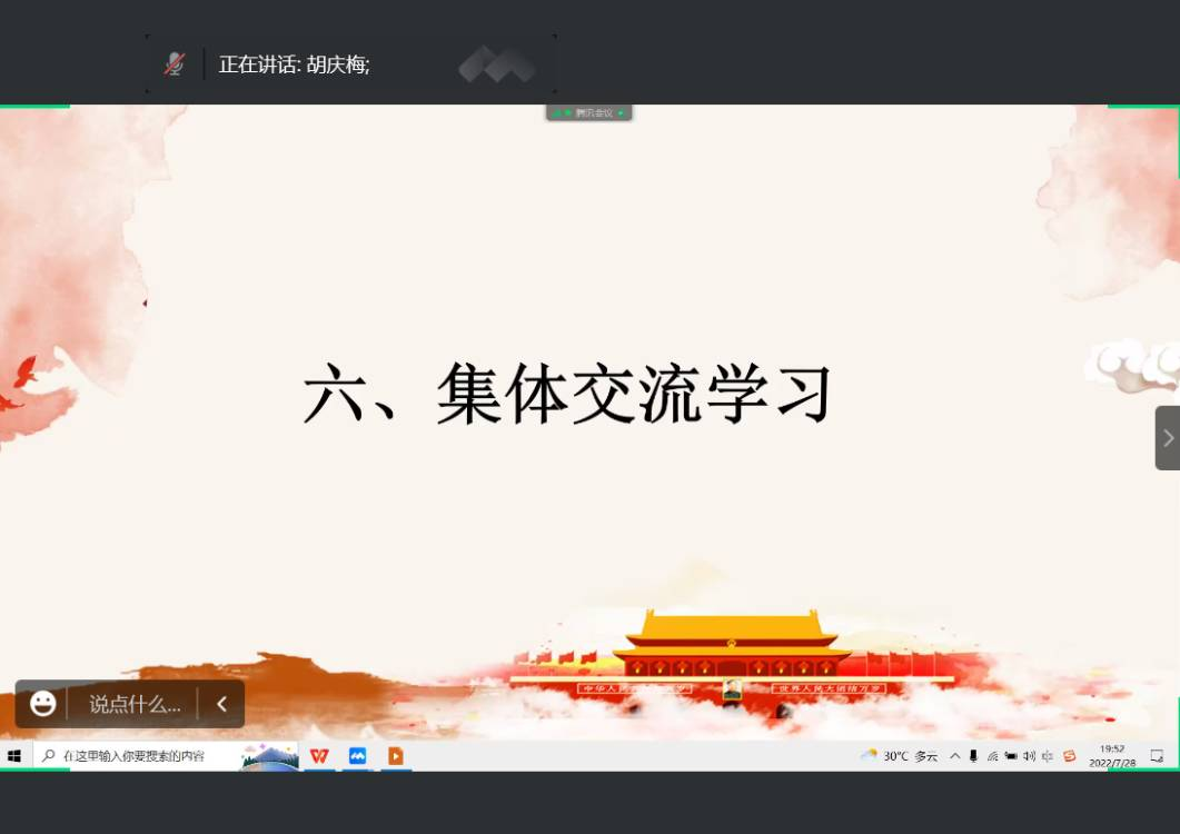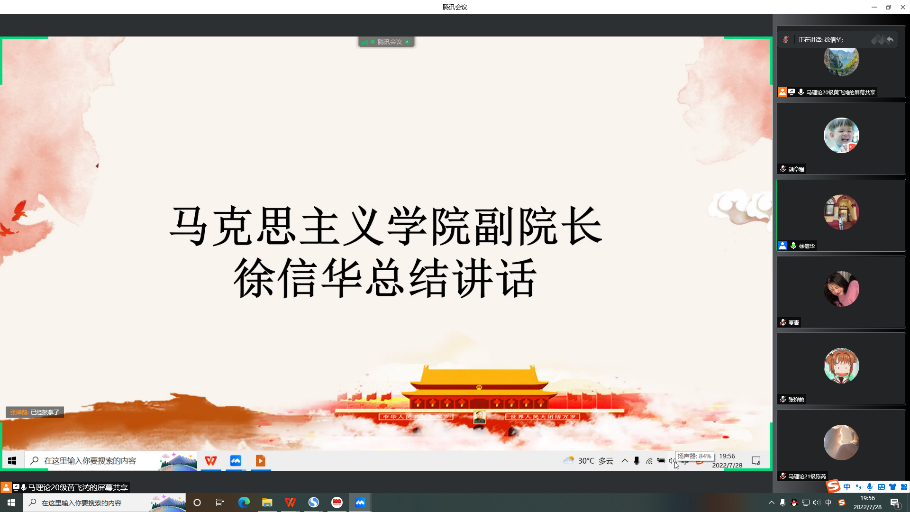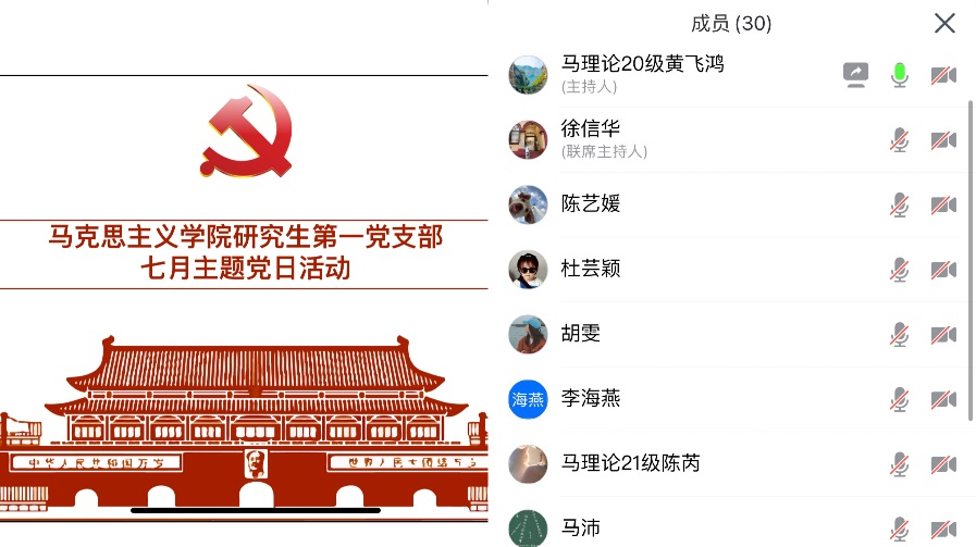 研究生第一党支部以线上形式举行了7月份主题党日活动,开展一系列内涵丰富的理论学习。学院副院长徐信华和研究生第一党支部全体党员参加活动,支部纪检委员黄飞鸿同志主持活动,徐院长作总结讲话。