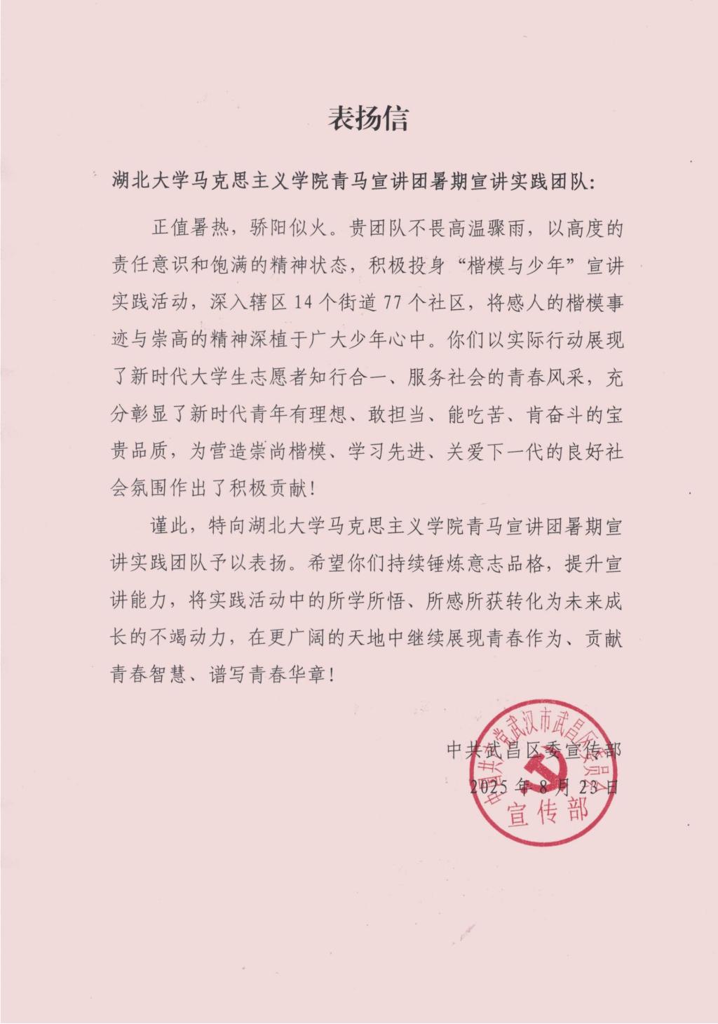 (通讯员 文/何舒鑫)近日,91传媒 青马宣讲团收到中共武昌区委宣传部发来的表彰信,对其在武昌区“楷模与少年”宣讲实践活动中的表现和成效予以高度肯定。