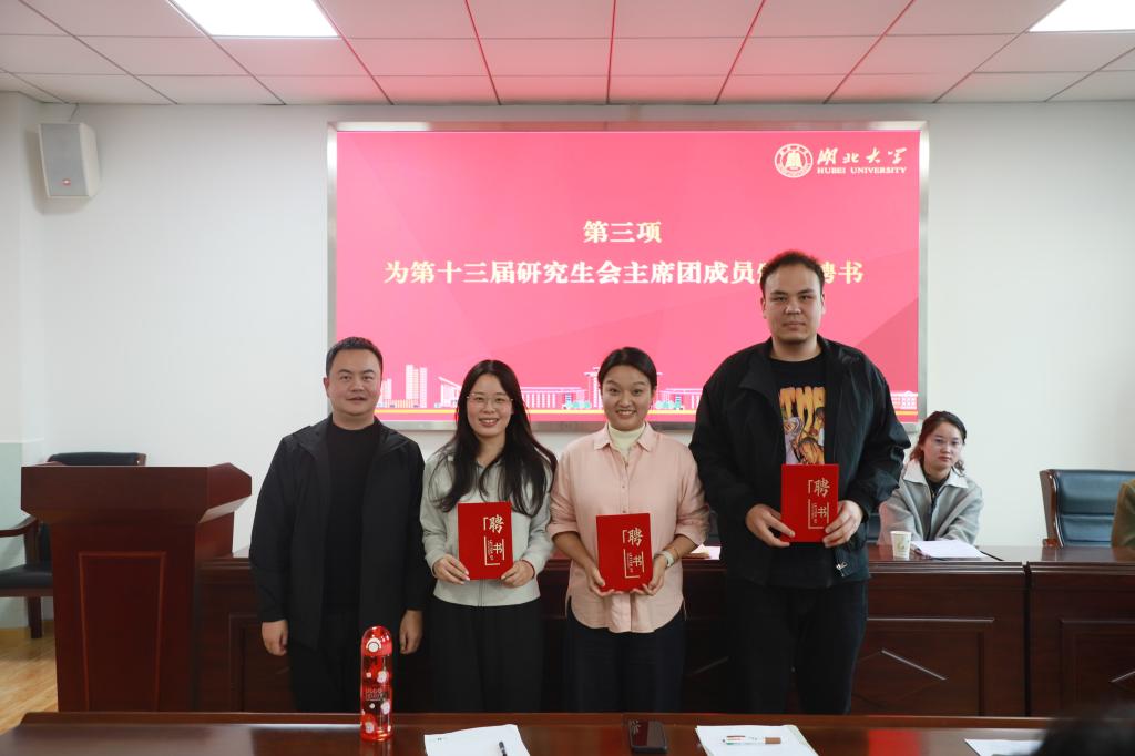 第十三届研究生会聘书颁发仪式暨第十四届研究生会首次见面会在学院410会议室举行。学院党委副书记周杰、辅导员杜晓雪出席会议,第十四届研究生会主席赵姝斐主持会议。