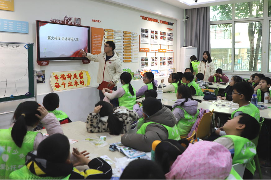 宣讲过程中,成员们借助图文并茂的演示和情景化的生动讲述,深情还原了姜能山老人一诺千金、数十载默默守护烈士陵园的感人事迹,将宏大的红色精神转化为孩子们可感可知的身边故事,帮助青少年深刻理解“坚守”二字的厚重内涵。同时,为深入解读党的二十届四中全会精神,宣讲团精选大量来自基层一线的鲜活案例,从校地协同的“双圈联动”,到深入乡野的“三下乡”实践;从奔赴西部的志愿服务,到扎根基层的青春创业,一个个真实故事生动诠释了“乡村振兴,人人皆可为”的时代强音,引导青少年感悟到:青春的价值,正蕴含在为家乡、为社会奉献的每一件小事之中。