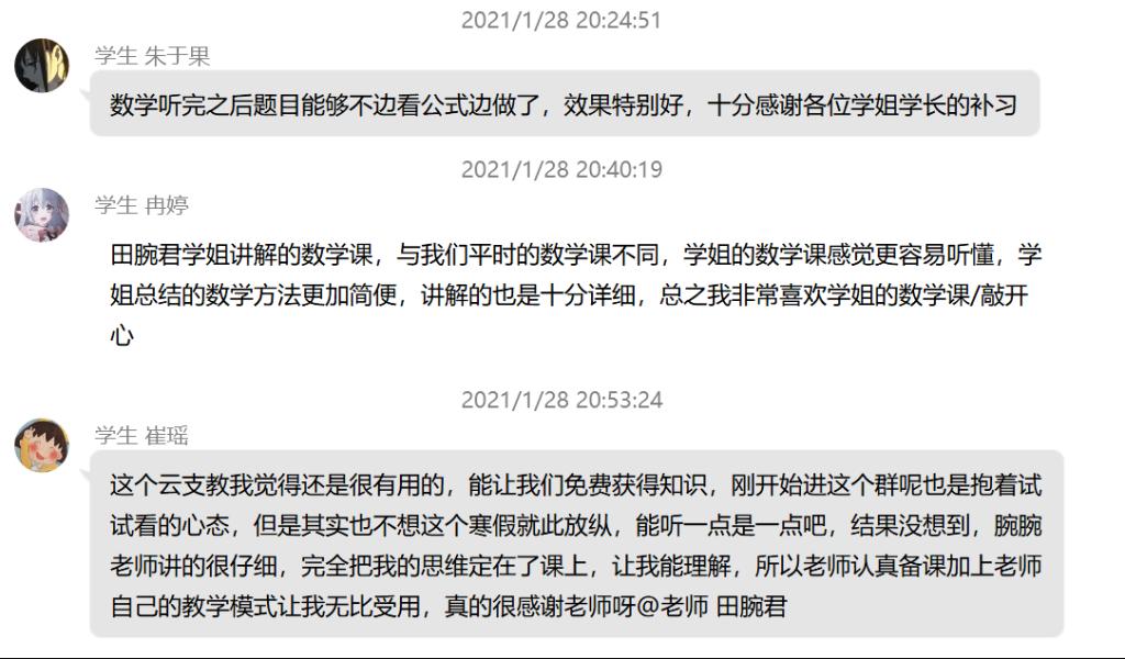 此次云支教除了“干货满满”的数学课,还设有各式各样的直播课和录播课。直播课不仅有北大、人大、武大的三位名校学长学姐来分享“学霸之路”,也有团队成员根据个人所在专业精心设置的专业讲解环节。录播课共计有十个板块,由团队成员轮流录制。政策研讨与高考志愿填报、诗词交流大会、拜拜鸭梨大……录播课的每一个板块都与高中生息息相关。此外,每节数学课后设有两小时的答疑环节,学习问题,生活烦恼……答疑领域十分广泛。