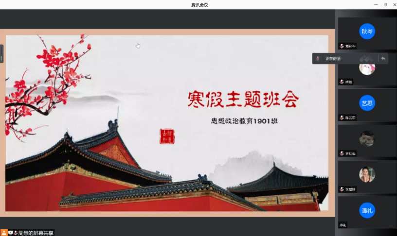 思政1901班组织召开以“传承中华传统文化,感恩敬老爱老”为主题的寒假线上班会,院党委副书记、思政1901班班主任晏妮老师和全体同学参加。本次班会由团支书周慧同学主持。