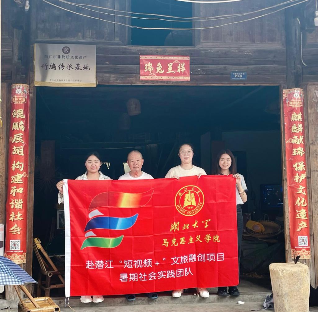 级本科生齐蓝儿、郑瑶瑶、赵倩、桂心乙、刘雪莹、肖雨琳六人组成的暑期社会实践团队,以“湖北省潜江市‘短视频+’文旅融创促进乡村振兴”为主题,前往潜江市老新镇村、莫岭村展开五天实地调查。在此期间调研团六人运用走访学习、实地了解、亲身体验的方式,掌握了当地非遗传承和乡村振兴各个方面建设的基本情况,并运用短视频的形式,探索新媒体在非遗和乡村振兴中的实际作用,探寻利用新的切实途径。