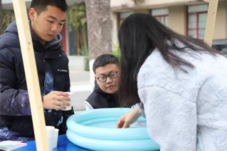 活动中设置了五个游戏,每个游戏都独具特色。“欢乐捞鱼行”活动吸引了许多学生积极参与。学生们纷纷拿纸网开始“捕鱼”之旅,在小鱼越来越接近水面时,逐渐屏息凝神,生怕一个动静就惊动了鱼儿。周围旁观的学生们也都更为好奇起来,不知最后能否成功。随着小鱼在纸网上跳动着,宣告着捕鱼成功,学生们的脸上也溢起笑容,心中的压力和烦恼也在那一瞬间随着鱼儿的跳动而随之忘却。