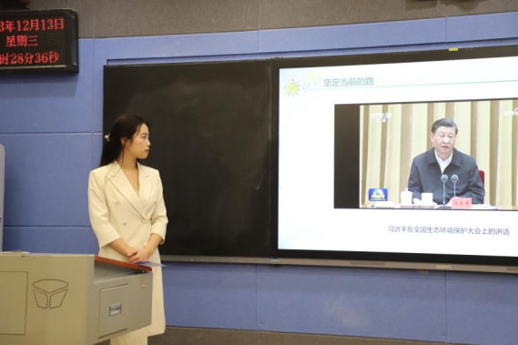 “青马”宣讲团的王润东以《弘扬生态文明 共筑绿水青山》为题,向大家分享了习近平生态文明思想的有关内容。在分享最后,王润东表示作为新时代青年,我们要力争做学习习近平生态文明思想的先行者、弘扬生态文明理念的传播者、推进生态文明建设的践行者、倡导生态文明行为的志愿者、营造生态文明风尚的引领者,在习近平生态文明思想的指导下,人与自然和谐共生的现代化定能实现。