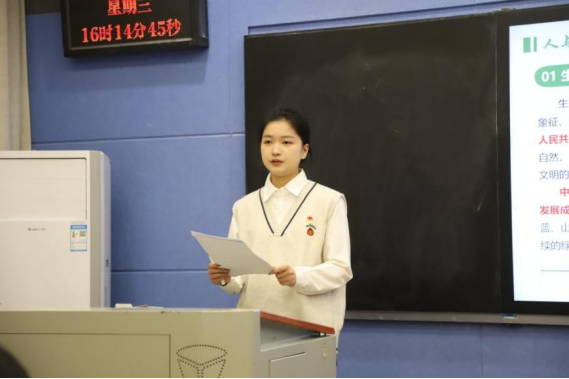 “青马”宣讲团成员张丁宁以《中国式现代化是人与自然和谐共生的现代化》为主题进行宣讲活动。她通过播放录像,展示了余村在“绿水青山”转变为“金山银山”的过程,并从背景介绍、文章解读和心理体会三部分进行了宣讲。向我们传递了“人不负青山,青山定不负人”的时代最强音,要坚持人与自然和谐共生,让绿色成为中国式现代化的底色,使在场的观众饱受熏陶,深受洗礼。