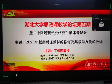 本次集体备课研讨会的主题是“2021年版纲要课教材的修订及其教学方法的改进”,会议邀请了武汉大学二级教授、博士生导师、2021年版纲要教材编委丁俊萍教授进行主讲。丁俊萍教授依据2021版教材的修订精神、涵盖教材框架结构和各版块内容、反映中国共产党百年奋斗的成就和经验以及体现思政课教学特点的原则,从教学设计的原则、思路、课堂教学设计、实践教学设计、线上教学设计、需要注意的问题六个方面,与大家分享了对“中国近现代史纲要”教材使用和教学设计的若干思考。在互动环节大家踊跃提问,询问丁老师关于新教材内容变动原因、如何填平文理科学生知识不均衡的鸿沟、怎样建设慕课以及如何解决马院与历史学院学科设置冲突等问题,丁老师一一给予答复。