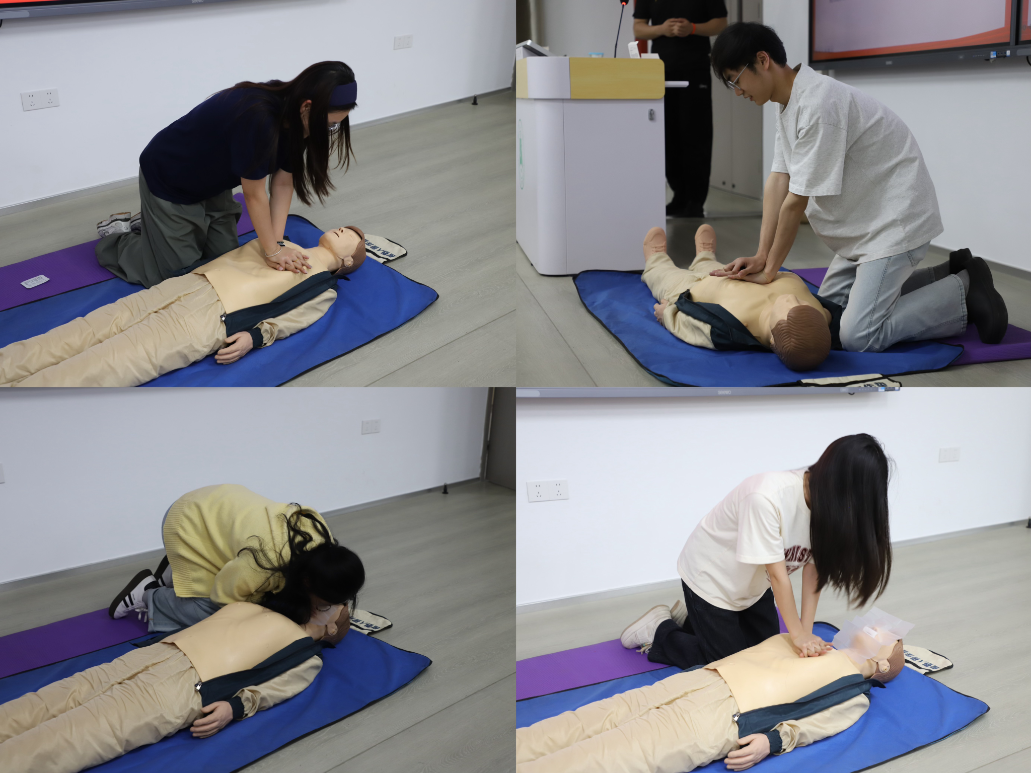 学生积极参与、认真练习,在体院同学的一对一指导下,逐步规范动作细节,熟练掌握操作技巧,现场观摩同学也认真记录、相互交流,进一步巩固了急救知识。