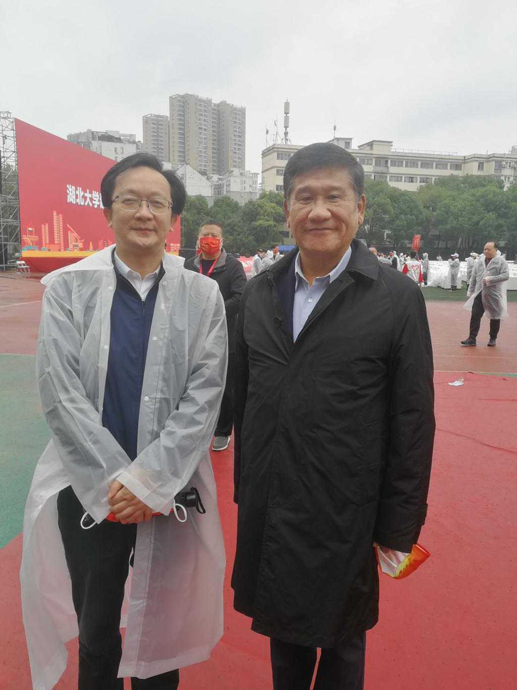 院长熊友华在大会会场,与77级政教专业校友李宪生亲切交谈,并征求了李宪生校友对学院发展的意见和建议。