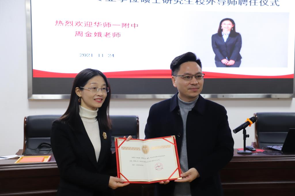 易振龙副院长为周金娥老师颁发学院硕士专业学位校外导师聘任证书,并对周老师来院讲座表示热烈欢迎。