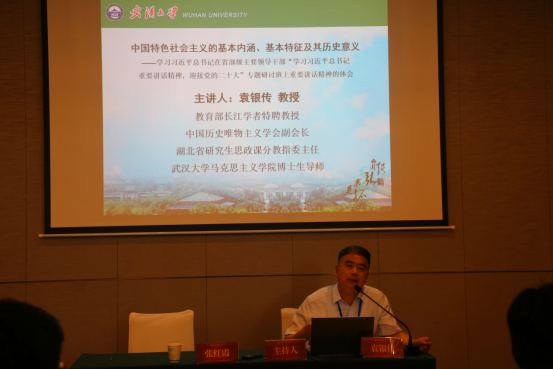 袁银传教授作了题为《中国特色社会主义的基本内涵、基本特征及其历史意义——学习习近平总书记在省部级主要领导干部“学习习近平总书记重要讲话精神,迎接党的二十大”专题研讨班上重要讲话精神的体会》的主旨报告。湖北省研究生思政课分教指委副主任、华中师范大学91传媒