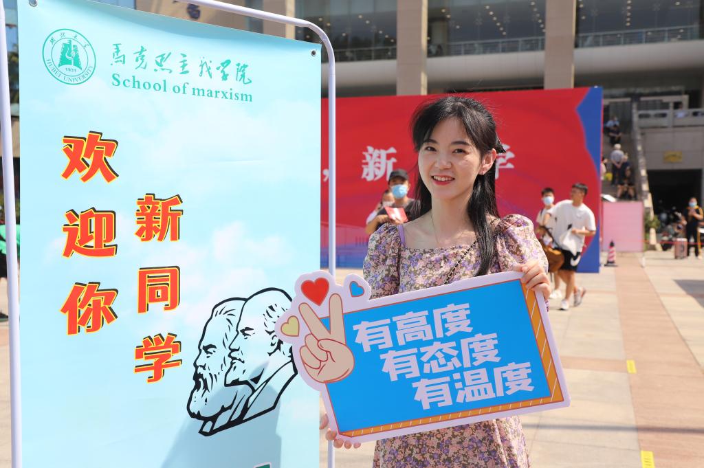 参与引导的老师和同学们精神饱满,热情迎接新同学的到来。学院在帐篷旁设置打卡处,新生手持“马院姓马,在马言马”、“有高度、有态度、有温度”、“新时代新使命、新思想新征程”等手持牌拍照留念,留下初到湖大时的美好瞬间。新生们按照流程完成报到手续后,在志愿者的帮助引导下前往宿舍办理入住手续。