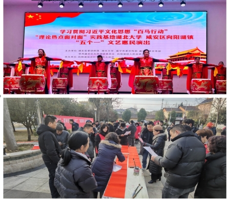 咸安区文旅局和向阳湖镇等单位为基层干部群众奉献了一场精彩的惠民演出。气势磅礴、雄浑有力的锣鼓表演,声行并茂、绘声绘色宣传二十大精神的快板,余音绕梁、感心动耳的个人独唱,节奏感强、活力四溢的群体舞蹈,这些精彩纷呈的表演主要由当地文艺群体承担,演出和习近平文化思想知识抢答交叉进行,赢得现场群众的阵阵喝彩。在惠民演出的同时,向阳湖镇政府院外还同步开展了文化活动,现场不仅展出“学习强国”展板,通过展板向广大群众宣传习近平文化思想的深刻内涵和地方实践。咸安区文联还组织书法家现场书写春联,并赠送给当地群众,这些春联成为传播“团结”“家国”文化理念和情怀有效载体,让群众感受到了中华优秀传统文化魅力。